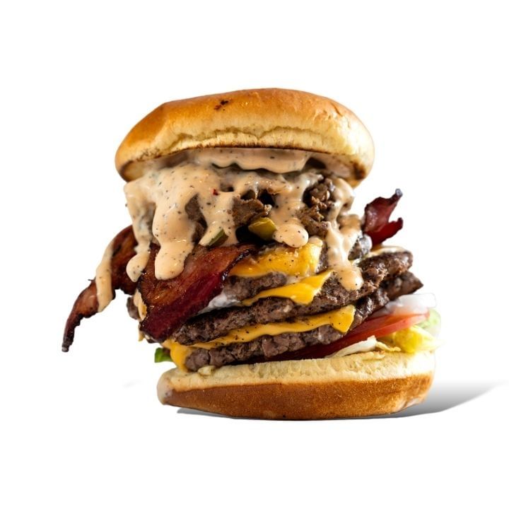 This monstrosity packs 3 Juicy Beef Patties, Gyros, Beef Bacon, Philly meat, Cheese, Lettuce, Onion Rings, BBQ sauce, and our Special Student Sauce